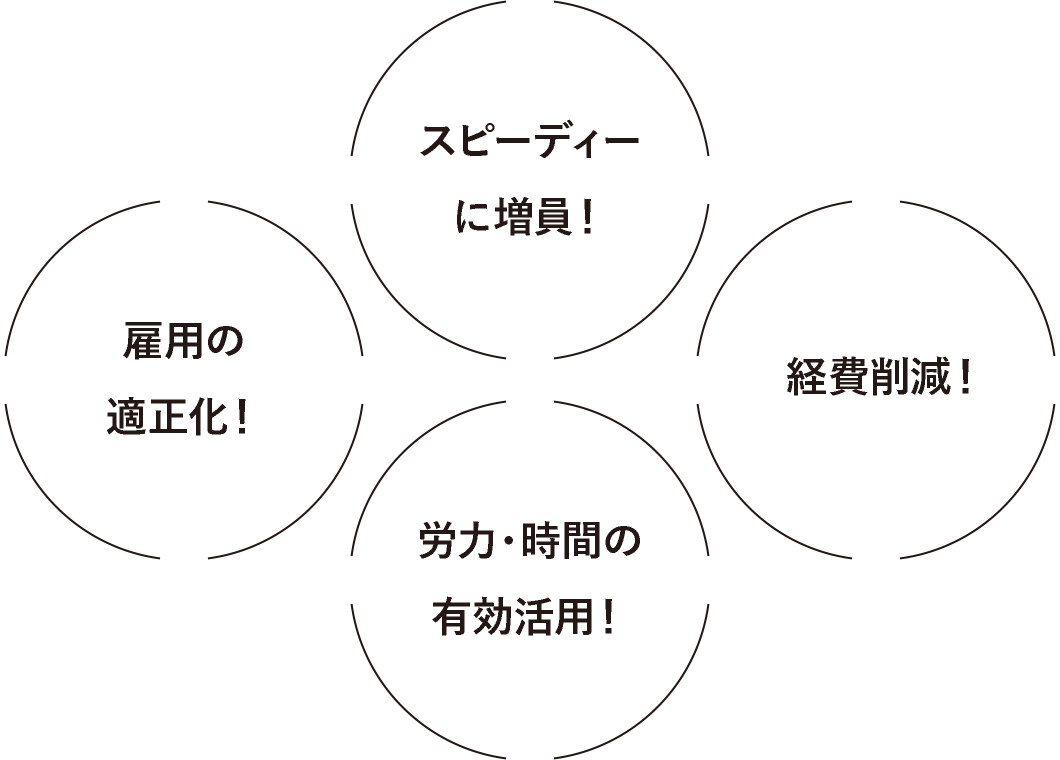 スタッフ増員は、新規採用より派遣サービスをご活用頂く事で、 よりスマートに経営できる場合もあります。 是非、一度派遣サービスをご検討ください。